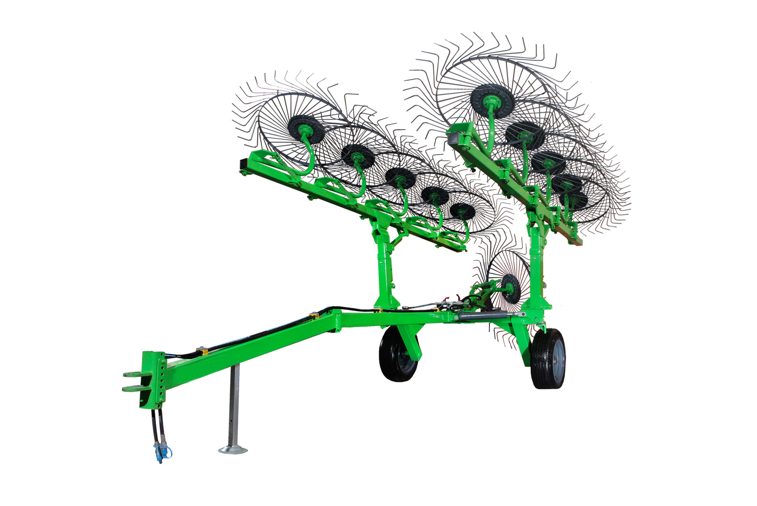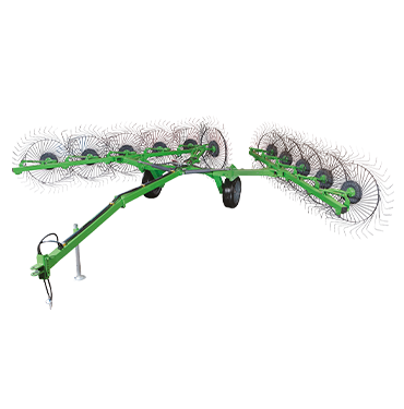 Pull type wheel rakes are available 4 different models in working widths up to 7.50m. Wheel rakes are built to handle high capacities. Featuring quick, simple adjustments and heavy-duty construction ensures season after season of durability. Each rake wheel has its own spring and adjustment chain enabling the correct pressure on the ground to be obtained regardless of the crop and type of ground.